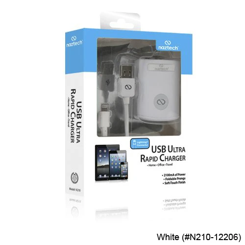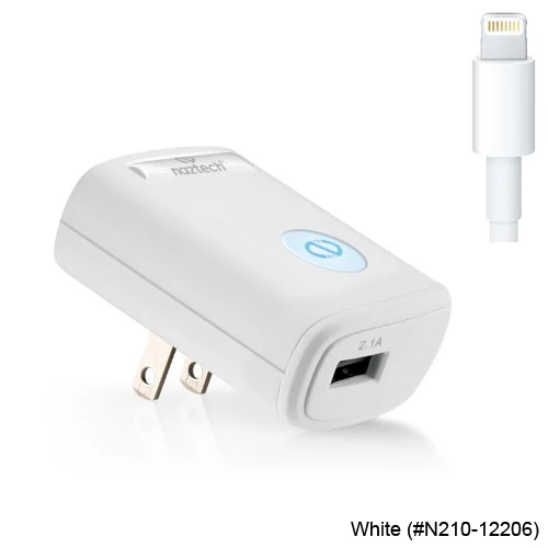 Naztech 2.1A Lightning 8 pin Travel ChargerThe Apple-certified Naztech N210 Lightning 8-pin charger is a unique and powerful AC charger designed to rapidly charge all Apple devices utilizing the Lightning connector. This advanced charger sports a soft-touch, rubberized matte white finish, foldable prongs and 2100mA of power! The N210 automatically adjusts from 90V to 240V, making it the perfect charger on the go. With its 5V USB port, you can also charge most USB powered devices.
