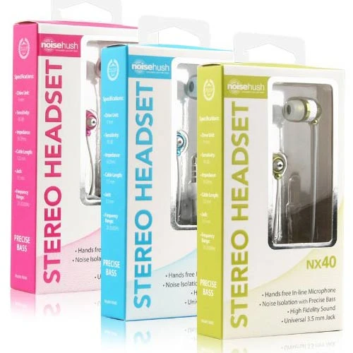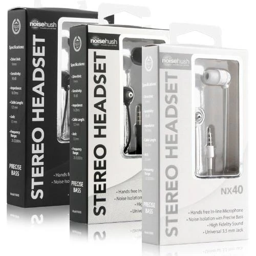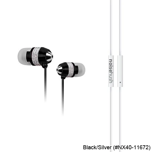 NoiseHush NX40 3.5mm Stereo Headsets with MicIndulge in some ear candy with the NoiseHush NX40. The aluminum casing remains light in the ear, while the titanium drivers provide jaw-dropping sonic fidelity, that only NoiseHush can provide. Turn it up.